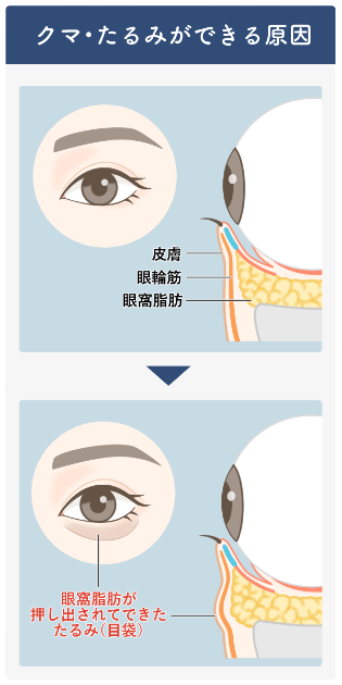 目の下のクマやたるみは、年齢と共に肌の弾力が失われ、眼窩脂肪と呼ばれる目の下の脂肪が前に押し出されることで発生します。